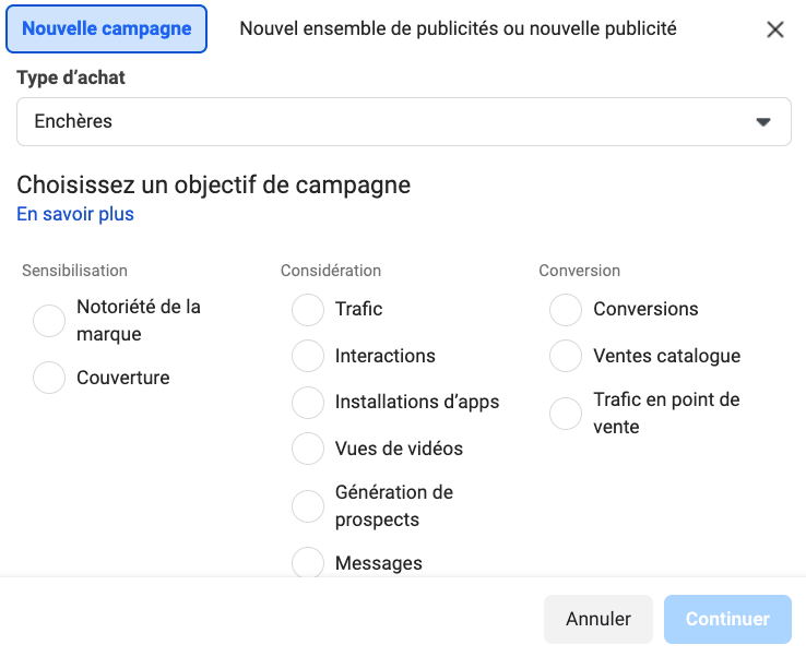 Vous accéderez ensuite à l’écran de choix de votre objectif publicitaire, avec les options suivantes :