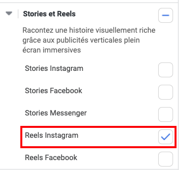 3) Sélectionnez le placement « Reels Instagram »