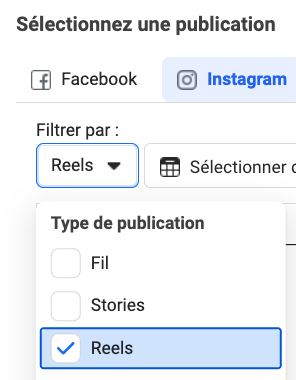Dans le cas où vous choisissez « Utiliser une publication existante », vous serez en mesure d’aller piocher parmi les contenus déjà postés sur votre compte Instagram, et dans notre cas, les Reels.
