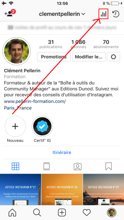 Similaires aux statistiques des publications classiques, celles-ci peuvent être trouvées en cliquant sur le bouton « Statistiques » accessible sur votre profil :