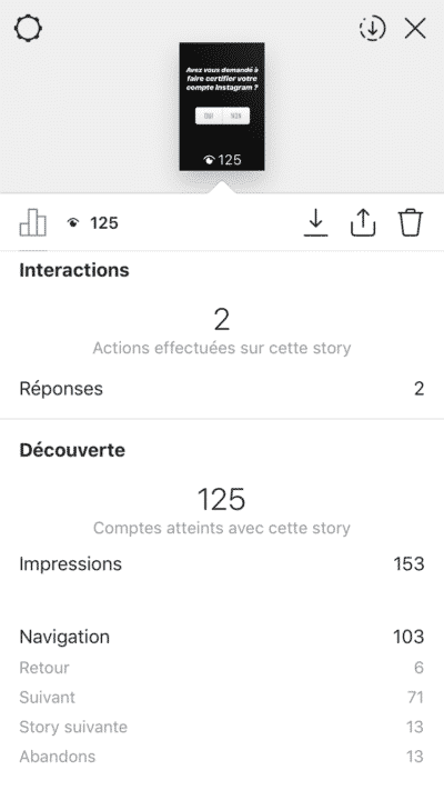 Vous obtiendrez alors de nombreuses statistiques qui vous permettront de mesurer le succès (ou insuccès) de vos Stories Instagram.