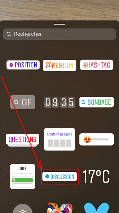 Démarrez par créer une Story comme vous avez l’habitude de le faire, en prenant une photo/vidéo avec la caméra ou la pellicule de votre smartphone. Ensuite, vous aurez la possibilité d’ajouter de multiples autocollants, dont celui nommé « Discussion » :