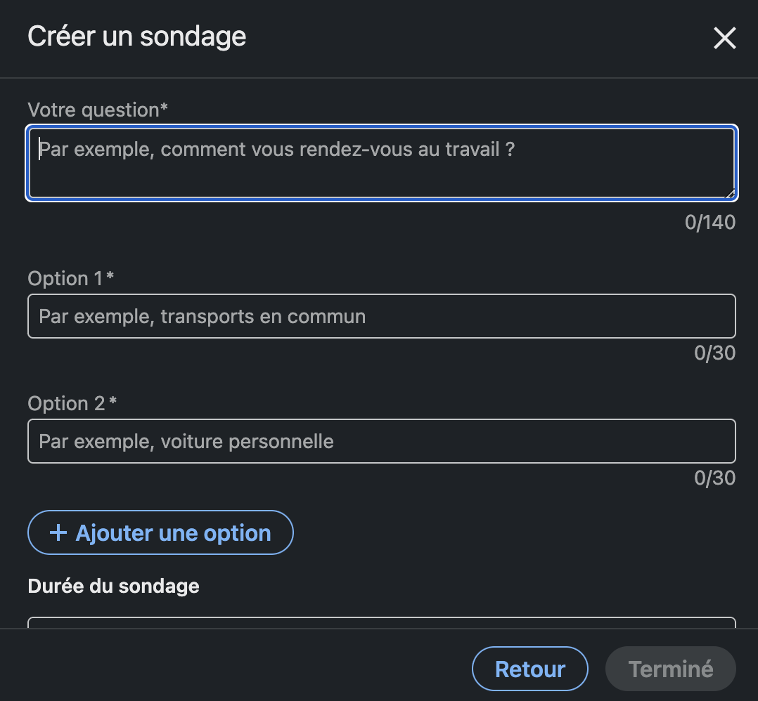 Chaque sondage comporte une question unique et jusqu’à quatre réponses, et peut durer jusqu’à deux semaines. Bien que les questions ne puissent comporter que 140 caractères, vous pouvez utiliser la limite de 3 000 caractères du post pour fournir un contexte supplémentaire ou poser la question.