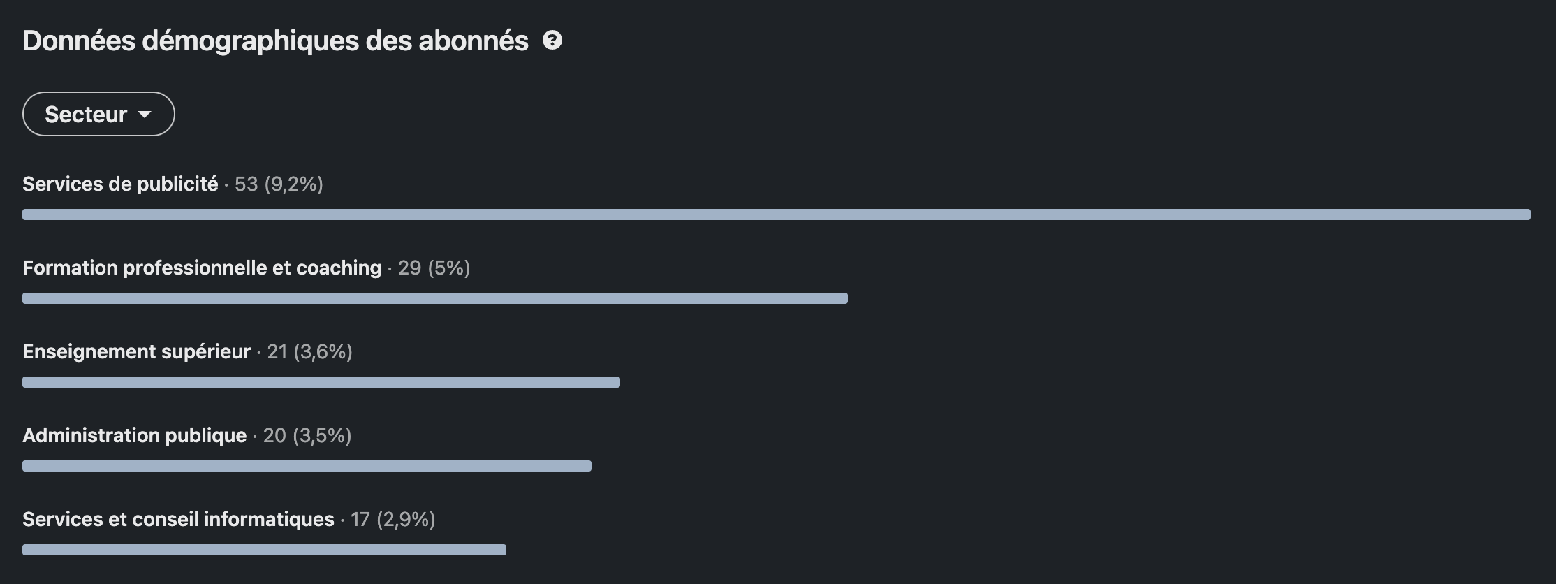 Pour accéder à ces informations, rendez-vous sur votre page d’entreprise LinkedIn et sélectionnez « Abonnés » dans le menu déroulant « Statistiques ». Faites défiler jusqu’au bas de la page pour afficher des données démographiques telles que le secteur d’activité, la fonction, l’ancienneté et le lieu.