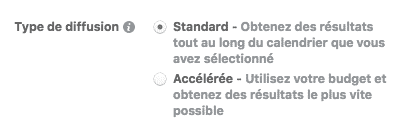 Le type de diffusion « Standard » est sélectionné par défaut et est le plus courant. Lorsque vous choisissez cette option, Facebook diffusera de manière proportionnelle votre campagne tout au long du calendrier que vous aurez défini.