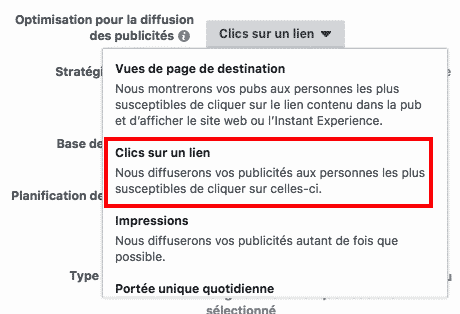 Par exemple, si vous sélectionnez « Clics sur un lien », Facebook affichera votre publicité sur les écrans des personnes ayant l’habitude de cliquer sur les publicités.