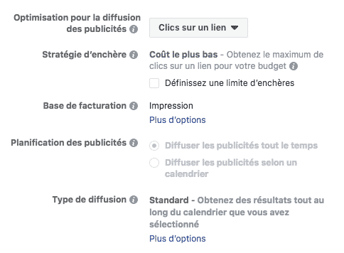 L’optimisation de la diffusion impactera également la manière dont vous serez débité. Dans le cas du choix « Clics sur un lien », vous serez facturé à chaque clic des internautes sur votre publicité, alors que dans le cas du choix « Vues de page de destination », vous ne serez débité uniquement lorsque l’internaute est venu sur votre page web sponsorisée. La nuance est importante car il arrive que certaines personnes cliquent mais pour de multiples raisons ne se rendent pas sur la page web en question.