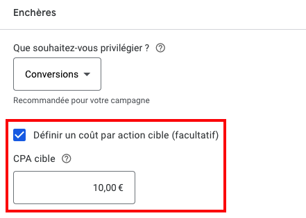 Le choix de la stratégie d’enchères « CPA cible » (Coût par acquisition cible) est pertinent dans le cas où vous souhaitez optimiser votre campagne pour générer des conversions à un coût cible défini par vos soins.