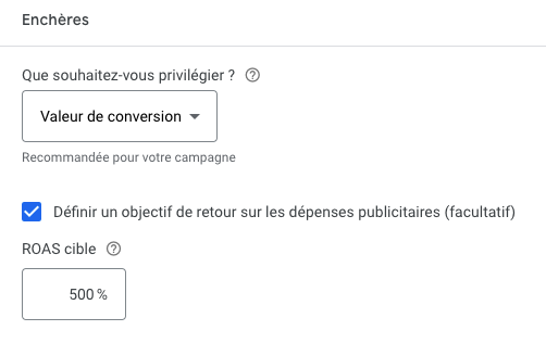 4) Stratégie d’enchères Google Ads fréquente : Valeur de conversion avec ROAS Cible