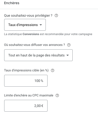 Définissez ensuite le taux d’impressions cible en % puis votre limite d’enchère au coût par clic (CPC).