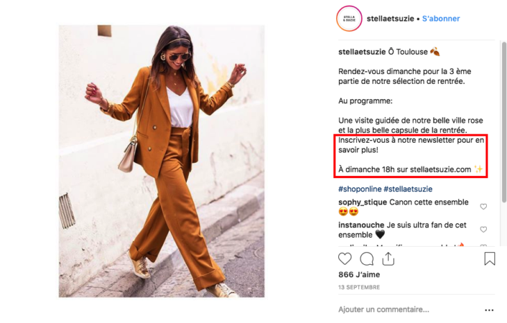 C’est pour cela qu’il est important de toujours rechercher des opportunités de faire venir les internautes depuis Instagram vers votre site e-commerce. Si vous vendez à des particuliers, vous pourriez proposer un code promotionnel sur vos publications à utiliser sur votre e-shop. Si vous vendez à des professionnels, vous pourriez mettre à disposition un e-book gratuit afin d’inciter les personnes à s’inscrire à votre liste e-mail.