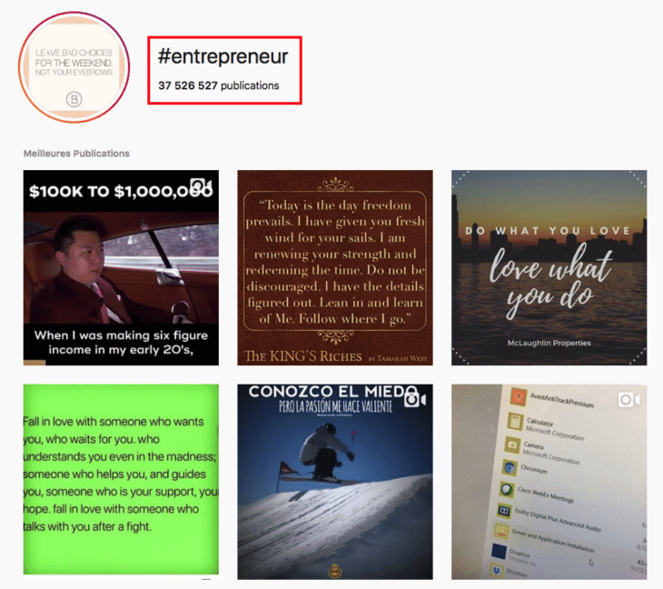 En reprenant l’exemple d’un marketing à destination de femmes entrepreneurs, vous pourriez penser que le hashtag #entrepreneur est une bonne idée. Pas tellement en fait, car il existe plusieurs millions de publications référencées avec ce mot-clé, ce qui signifie que vous ne générerez quasiment aucune visibilité en raison de sa saturation.