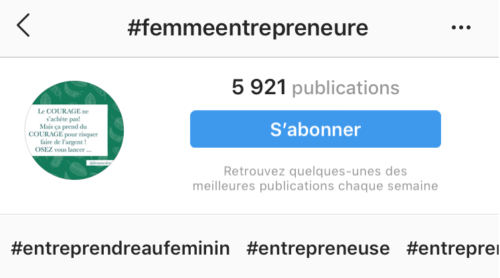Au lieu d’utiliser des hashtags trop populaires, réfléchissez à des termes plus spécifiques par rapport à votre audience cible. Dans le cas de notre exemple visant à atteindre des femmes d’affaires, vous pourriez exploiter le hashtag #femmeentrepreneur et observer également les suggestions connexes proposées par l’application :
