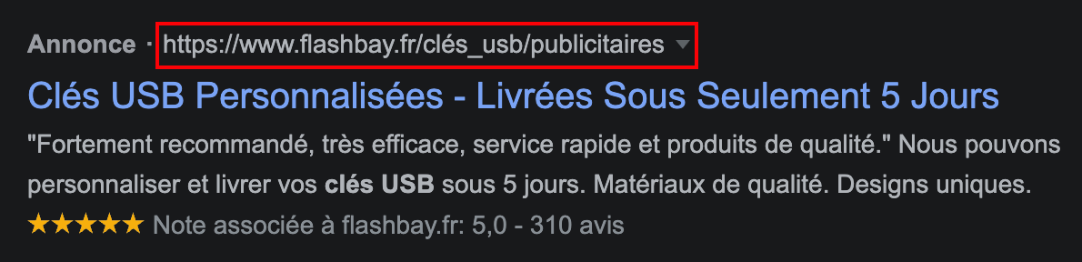 Google Ads affiche le chemin vers lequel les internautes sont redirigés en haut des titres de votre annonce, si vous le renseignez au moment de la création de votre campagne.
