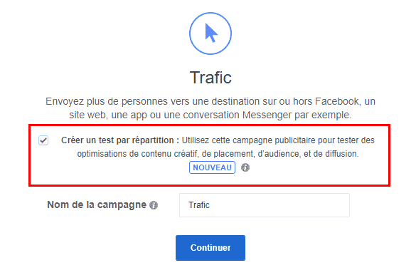Lorsque vous sélectionnez l’un de ces objectifs pour créer votre campagne, vous pouvez cocher la case « Créer un test par répartition ».