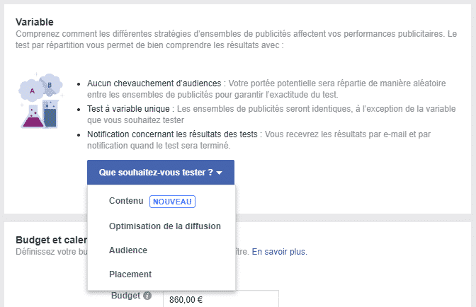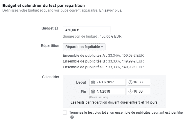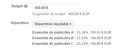 Par défaut, Facebook vous propose de répartir votre budget de manière équitable entre vos tests.