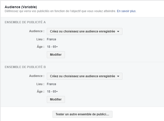 Dès que vous avez fait votre choix, Facebook vous propose de configurer 2 paramètres différents. Par exemple, si vous voulez tester votre publicité sur différentes audiences, le réseau social vous propose d’indiquer vos 2 cibles, mais vous donnera également la possibilité d’en ajouter d’autres avec l’option « Tester un autre ensemble de publicités » :
