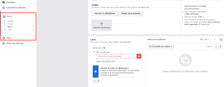 Facebook vous propose, par défaut, de créer une Pub A et une Pub B :