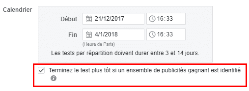 Enfin, pour éviter de diffuser une publicité trop longtemps, cochez la case « Terminez le test plus tôt si un ensemble de publicités gagnant est identifié ». Facebook stoppera la dépense et vous enverra une notification.