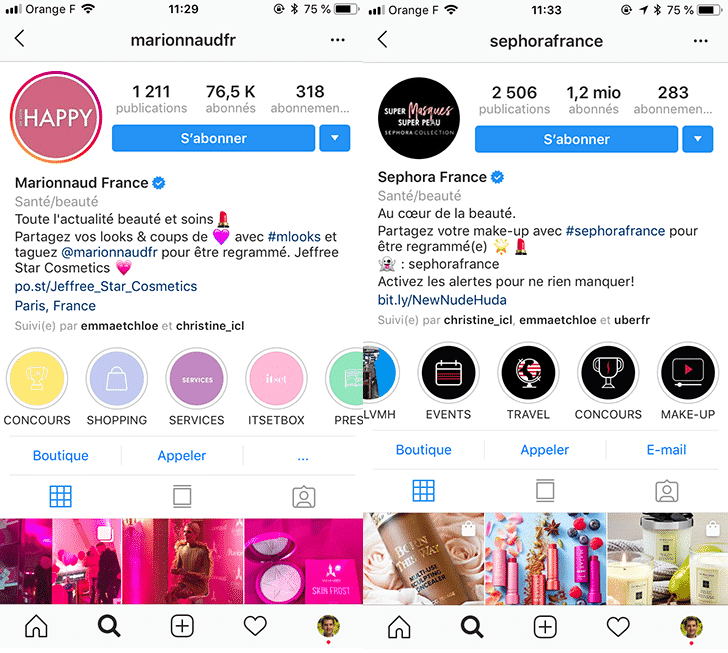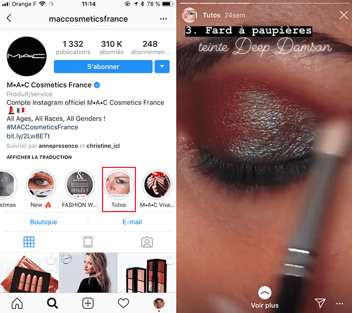 C’est le cas par exemple pour la marque de cosmétiques ci-dessous ayant créé une Story mise en avant spécifiquement dédiée à de nombreux tutoriels maquillage.