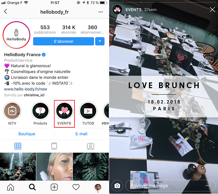 C’est le cas par exemple de la société HelloBody qui, par l’intermédiaire d’une Highlight Story nommée « Events », recense des photos & vidéos d’évènements importants :