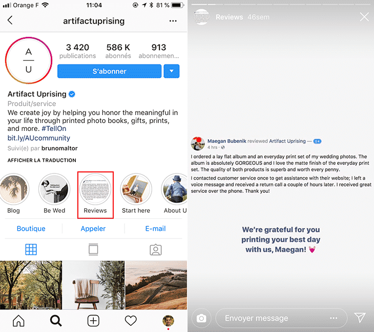 Est-ce que vos clients apprécient particulièrement vos produits & services ? Si c’est le cas, récupérer leurs témoignages et les partager dans une Story à la une peut être particulièrement puissant pour renforcer votre crédibilité et rassurer de potentiels clients.