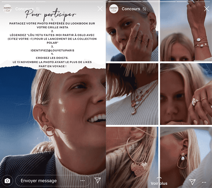 C’est ce que fait la société Louyetu en intégrant dans sa story les règles du jeu-concours ainsi que les photos pouvant être repartagées par les participants :