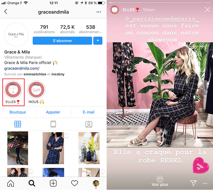 C’est le cas par exemple de la marque de vêtements ci-dessous ayant créé une Highlight Story recensant des photos sur lesquelles ses produits sont portés par des influenceuses :