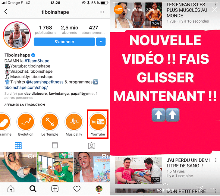 Par exemple, l’influenceur Tibo In Shape propose aux visiteurs de son profil Instagram de découvrir sa chaîne Youtube par l’intermédiaire d’une Highlight Story :