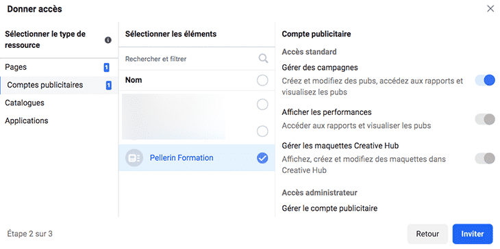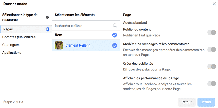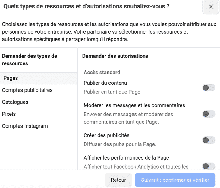 L’entreprise Business Manager qui recevra la demande d’accès devra ensuite choisir parmi ses différentes pages & ressources, quelles sont celles que l’entreprise en demande pourra gérer.