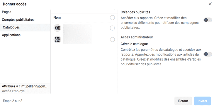 La prochaine étape consiste à allouer l’accès à diverses ressources déjà ajoutées à l’entreprise Business Manager Facebook, à destination de la personne dont vous venez de rentrer l’adresse e-mail, à savoir :