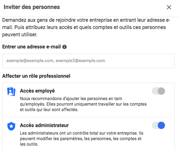 Si vous êtes administrateur d’une entreprise Business Manager Facebook, vous pouvez accorder l’accès à celle-ci ainsi qu’à diverses ressources à des personnes.