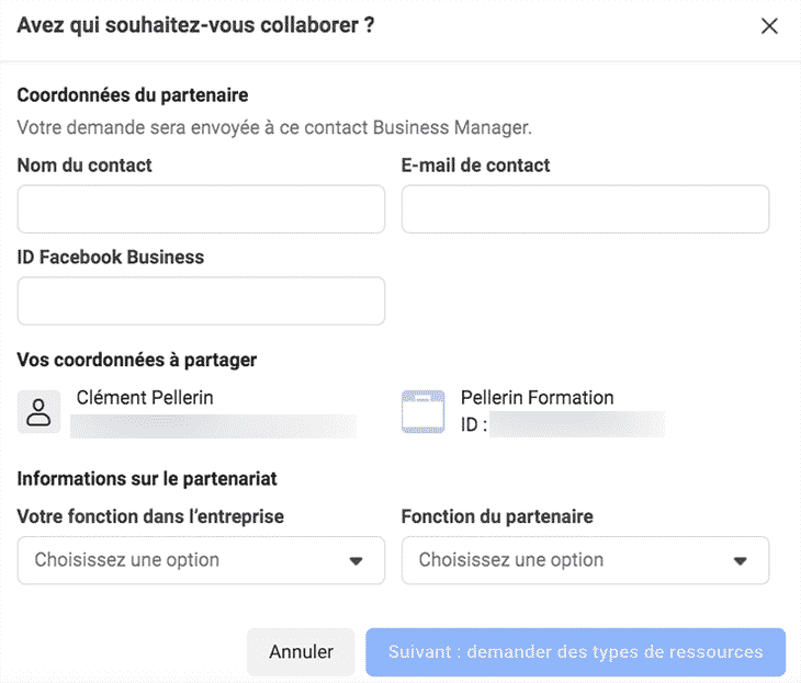 Dans un autre cadre, vous pourriez être amené à solliciter l’accès aux ressources d’une entreprise Business Manager Facebook externe.