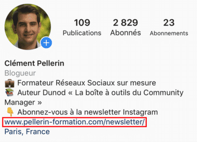 En voici un exemple ci-dessous provenant de mon compte, où je souhaite favoriser l’inscription des visiteurs à ma newsletter Instagram :