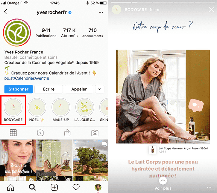 Dernière astuce concrète : servez-vous des Stories à la une pour promouvoir vos produits & services phares. C’est par exemple ce que fait la société Yves Rocher France en promouvant sa ligne de produits « Bodycare » tel que nous le voyons ci-dessous :