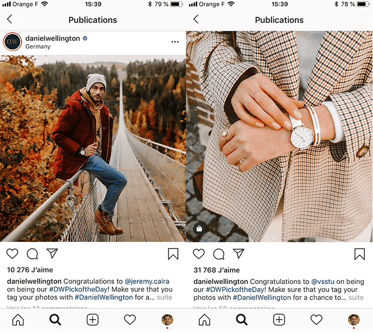 Par exemple, la marque de montres Daniel Wellington partage régulièrement des photos prises par ses clients, en ajoutant un hashtag dédié #DWPickoftheDay dans ses légendes.