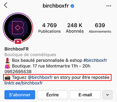 La marque de cosmétiques Birchbox incite ses abonnés à l’identifier dans une publication pour espérer être mis en avant dans ses Stories.