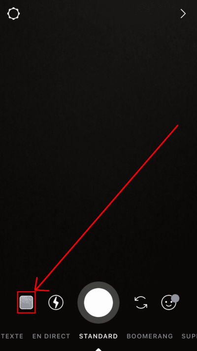 Une fois que vous avez découpé votre vidéo, ouvrez l’application Instagram et lancez le menu de création d’une nouvelle Story. Ensuite, cliquez sur l’image d’aperçu située en bas à gauche de votre écran afin d’accéder à votre pellicule de téléphone.